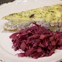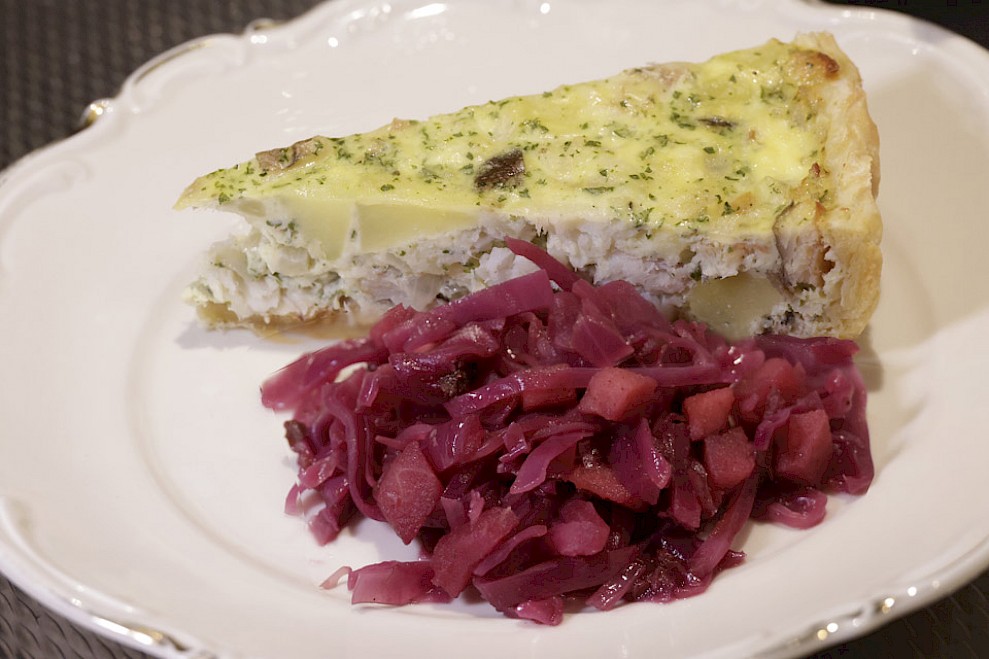 -leg de warme stukken hartige taart met de punt naar u toe links op de borden en schep een passende hoeveelheid frisse rode kool rechts